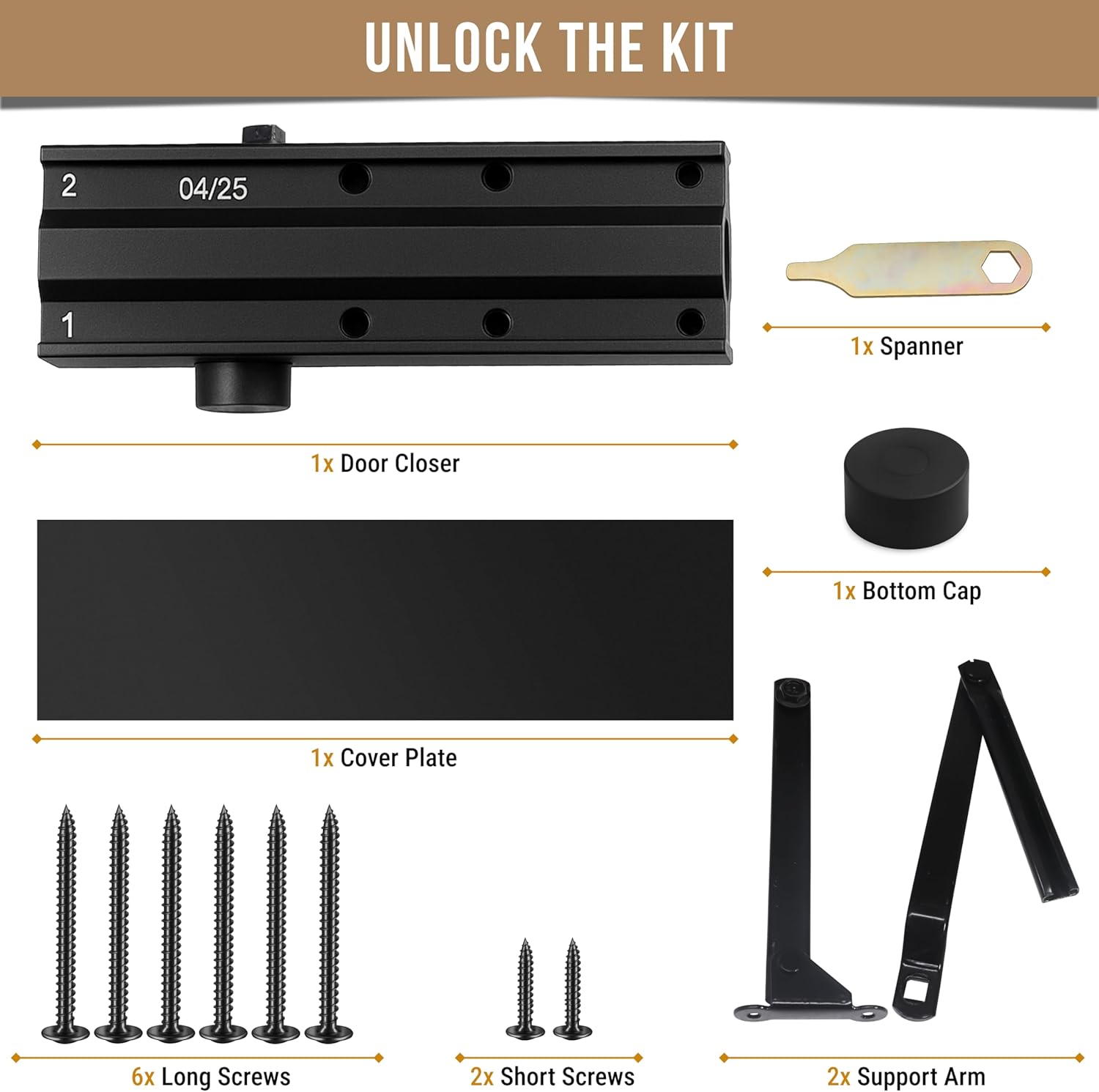 - Adjustable Door Closer – This automatic door closer is adjustable from size 2 to 4 (preset to size 2) to fit doors up to 100 kg (220 lbs) and 1250 mm (49 inch) wide, Also, offers adjustable closing speed, latching speed using separate valves
