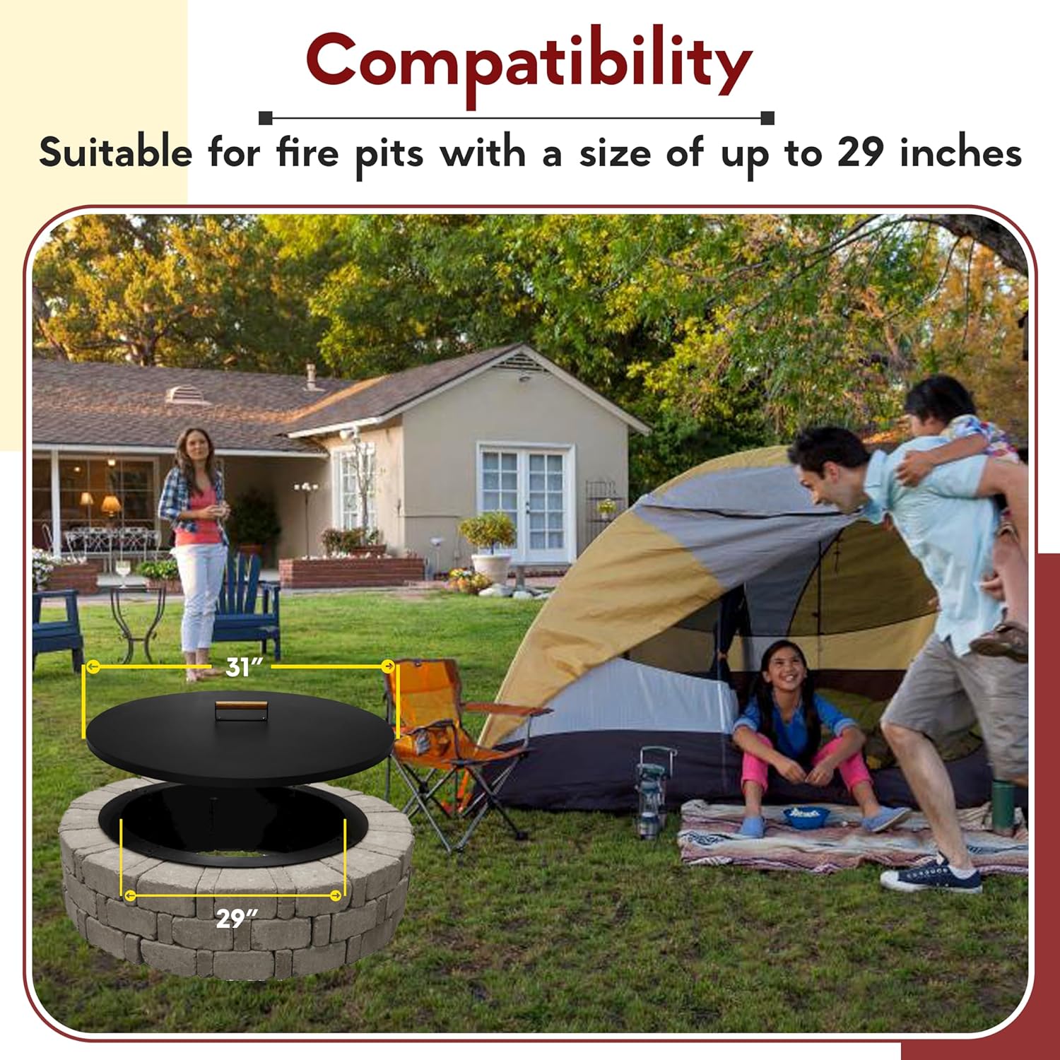 Our Fire pit lid measures 31 inch diameter & 1 inch height which is perfect compatible for outdoor fire pits.