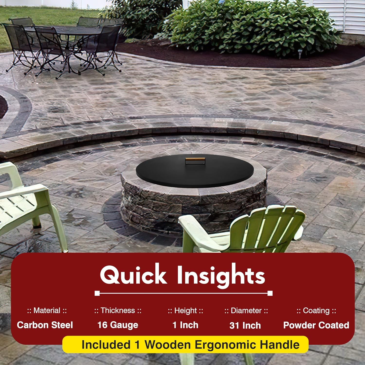 The fire pit lid is equipped with a high-quality rust-resistant powder coating, providing durability and protection against corrosion!
