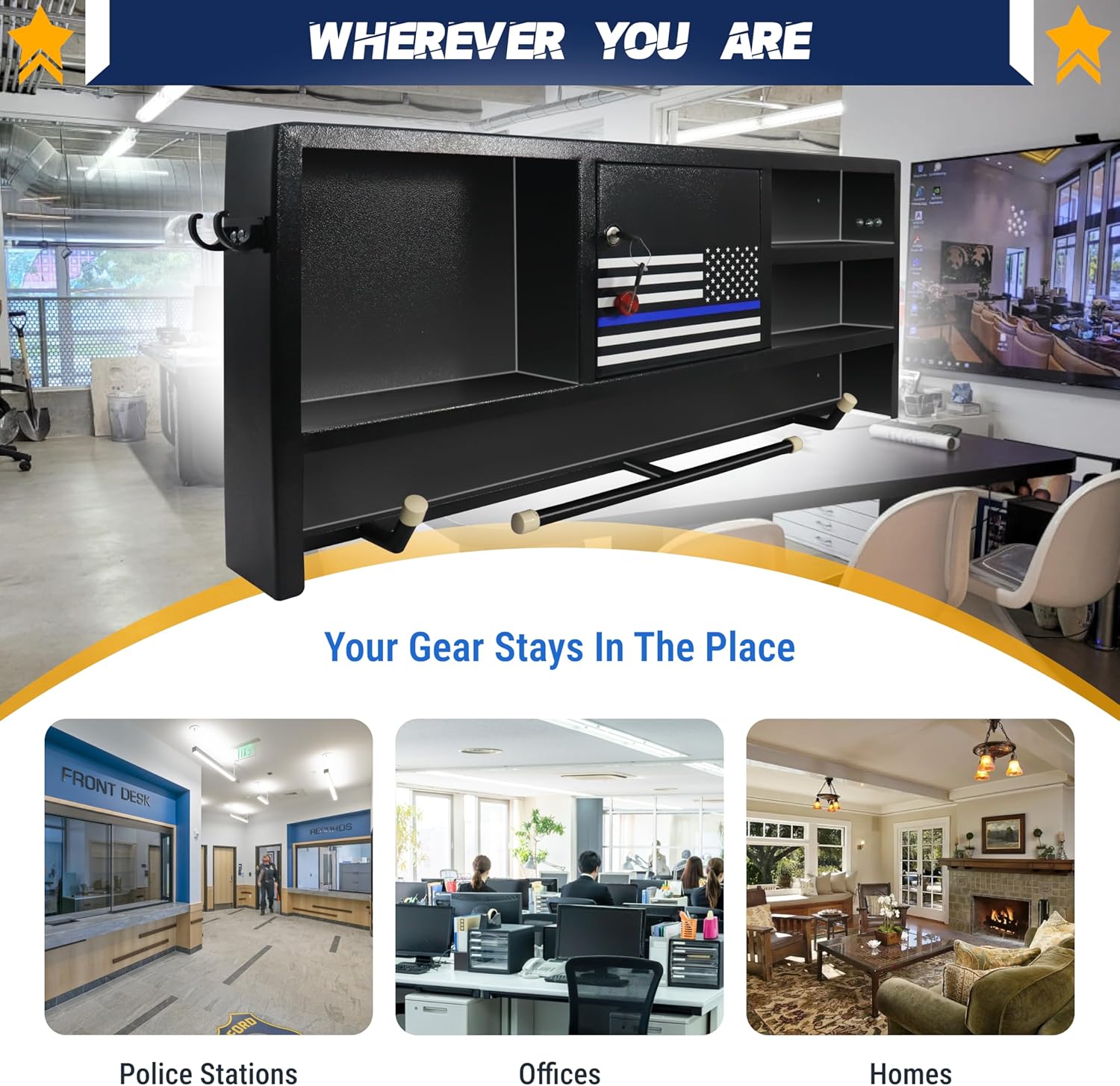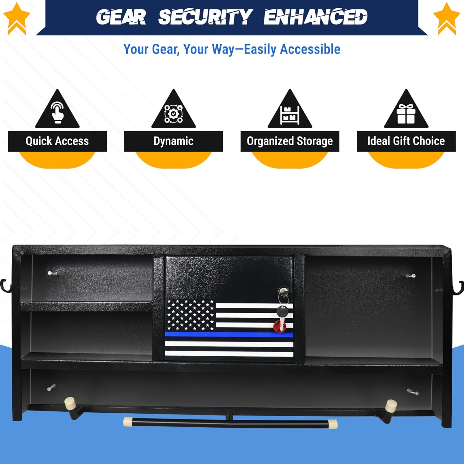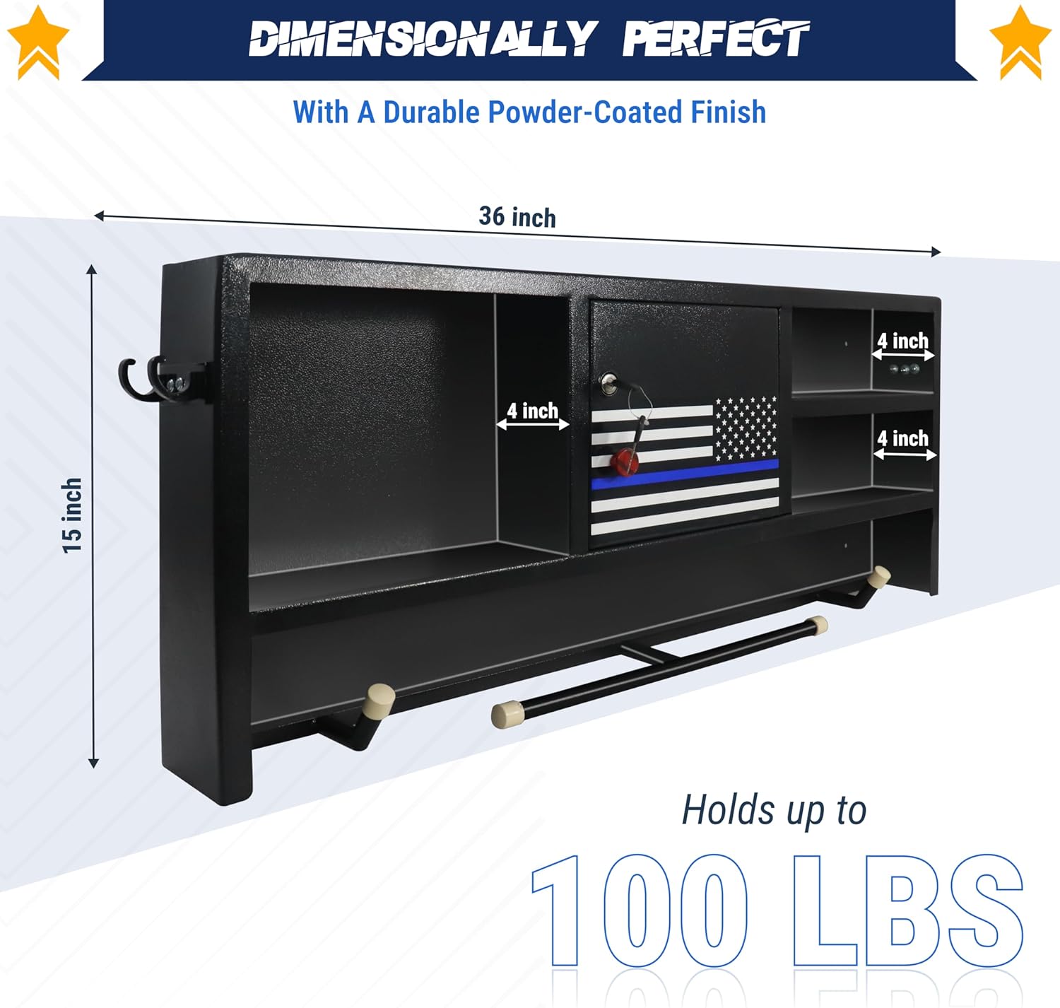 • Secure & Compact Setup: Designed with a lockable flag drawer, this wall mounted gun rack functions as a police locker organizer and gear locker, combining weapon safety with efficient space use. Also doubles as a gun rack for wall or gun shelf for secure gear display.