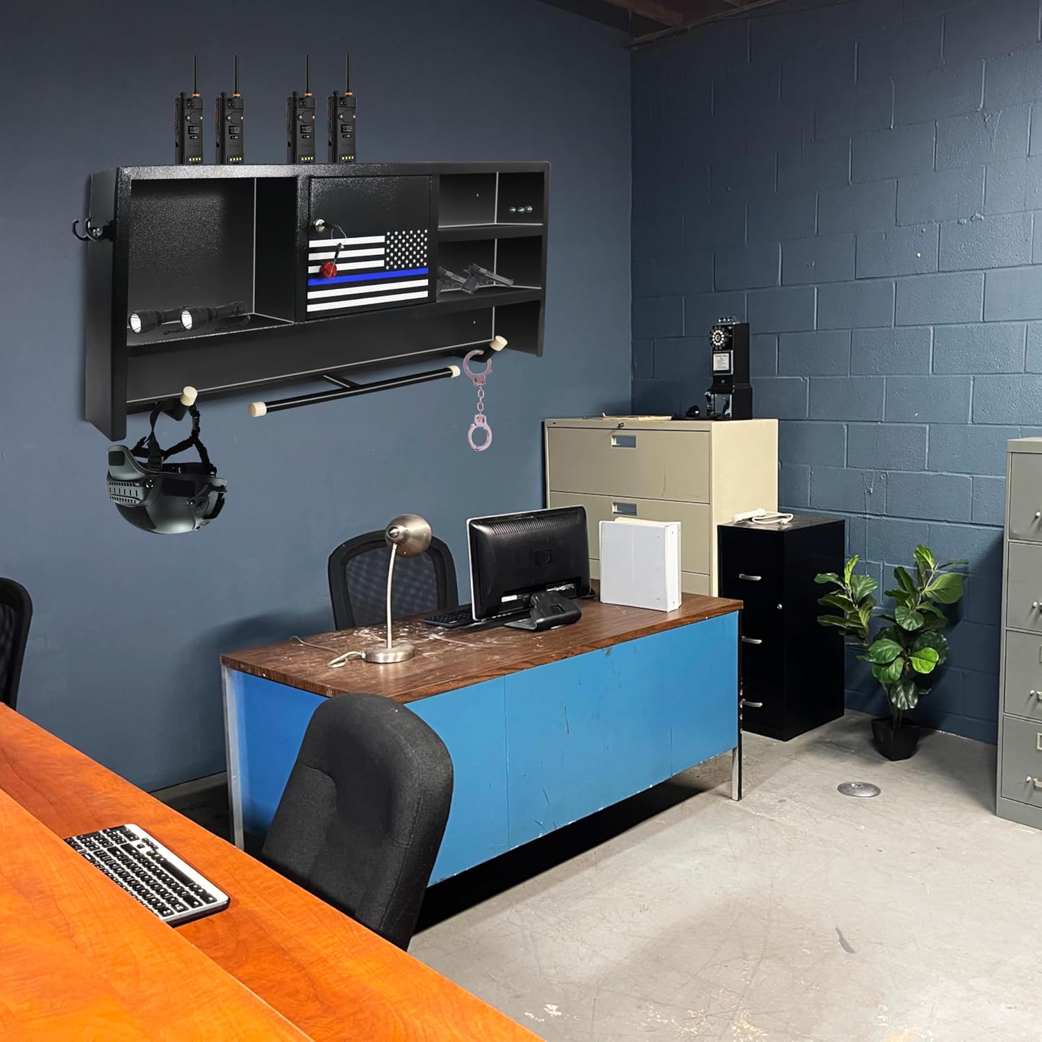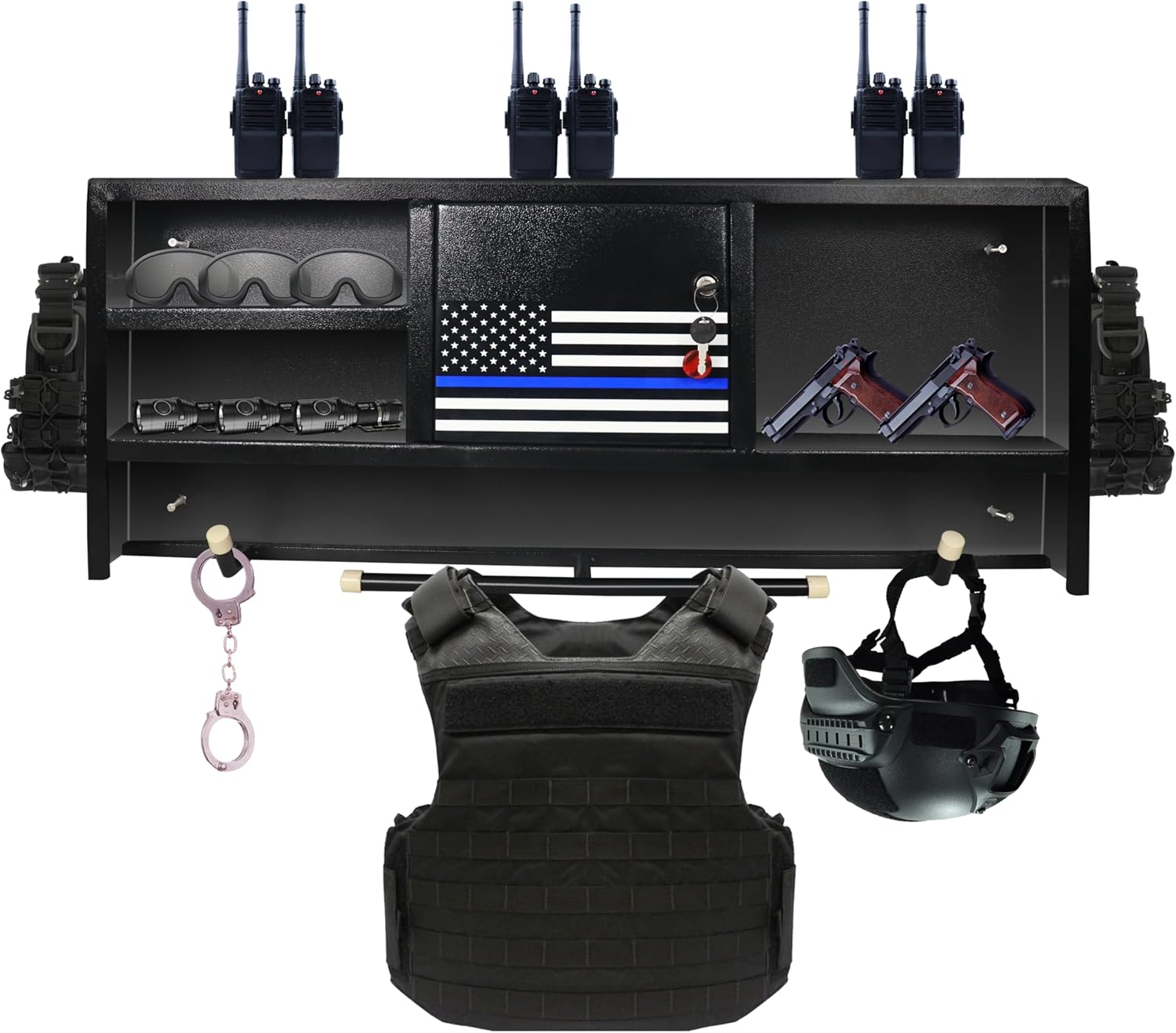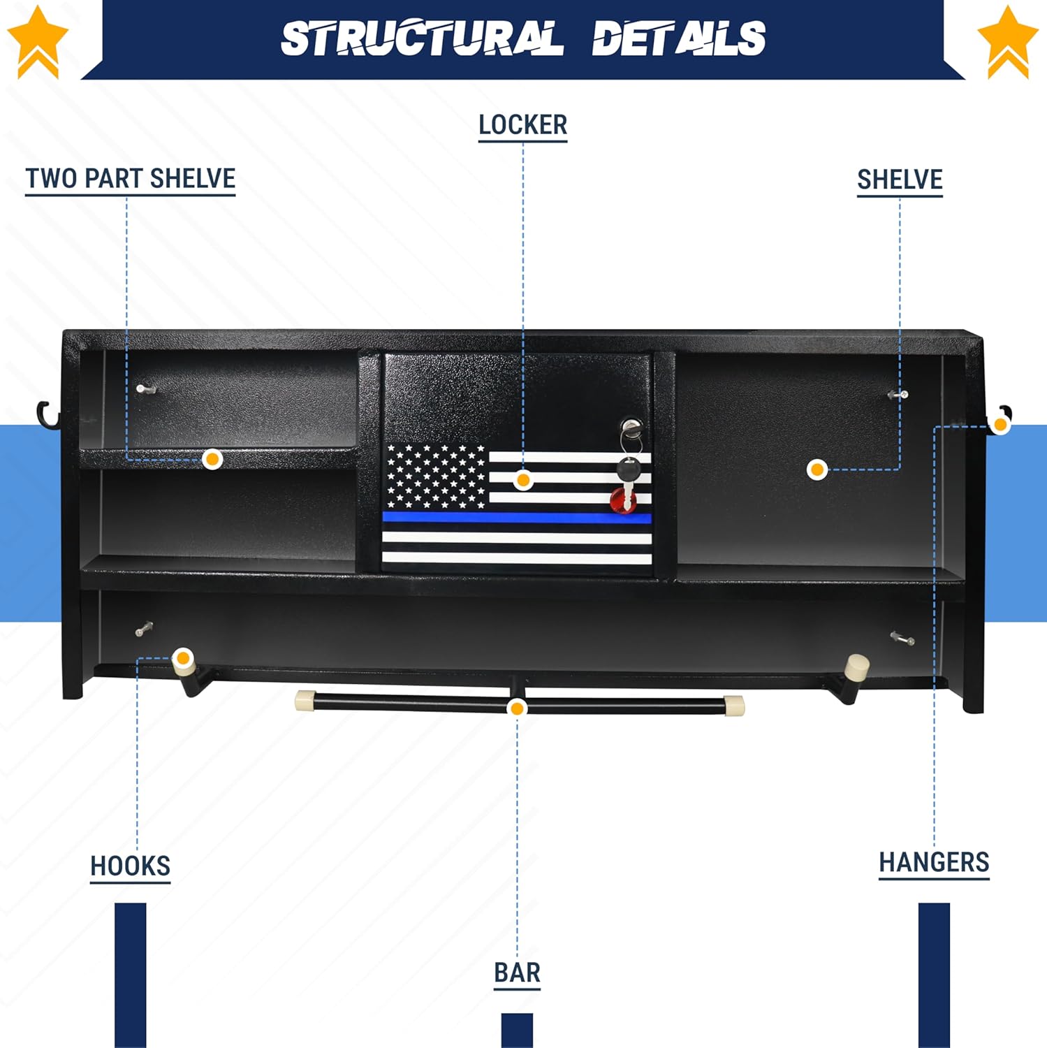 • Secure & Compact Setup: Designed with a lockable flag drawer, this wall mounted gun rack functions as a police locker organizer and gear locker, combining weapon safety with efficient space use. Also doubles as a gun rack for wall or gun shelf for secure gear display.