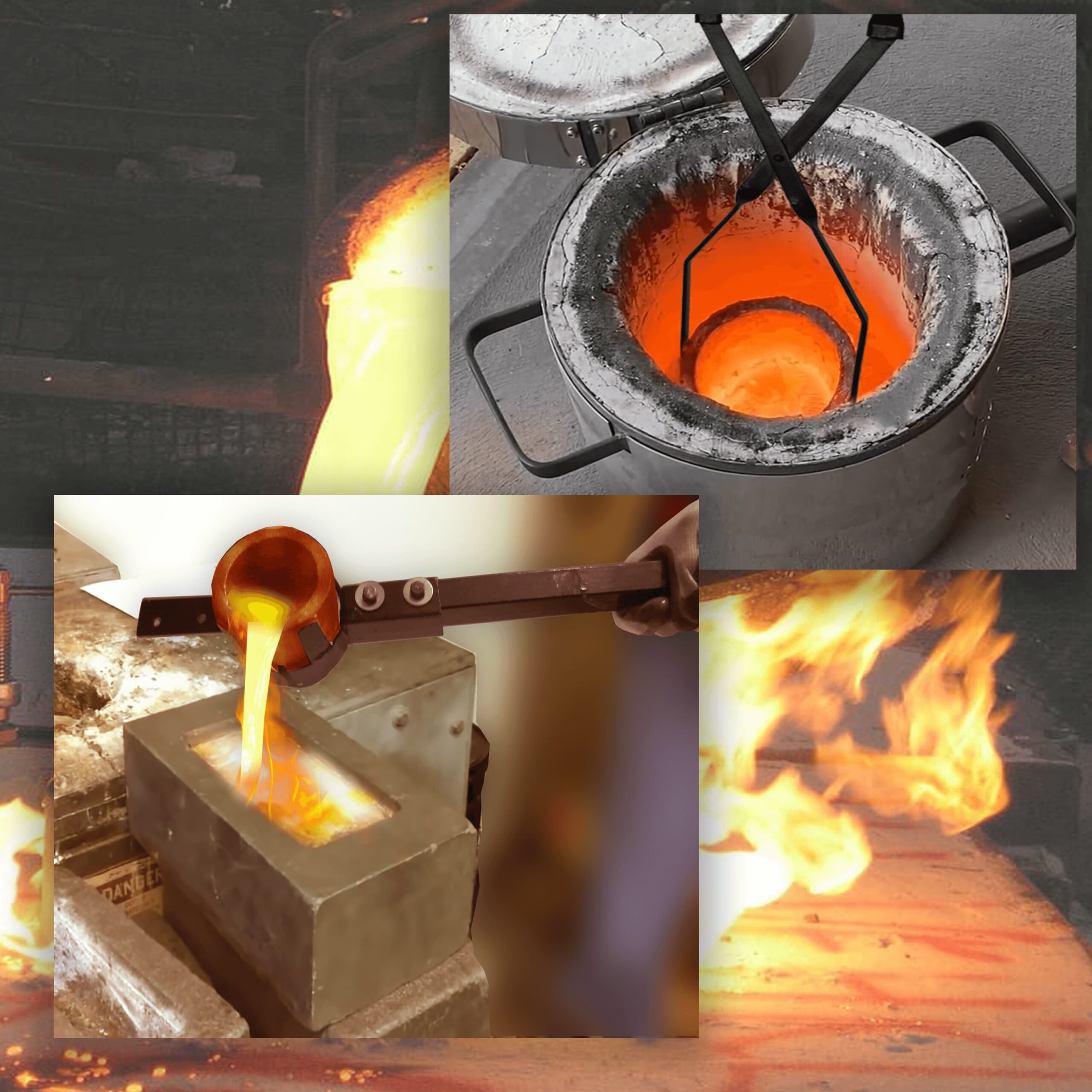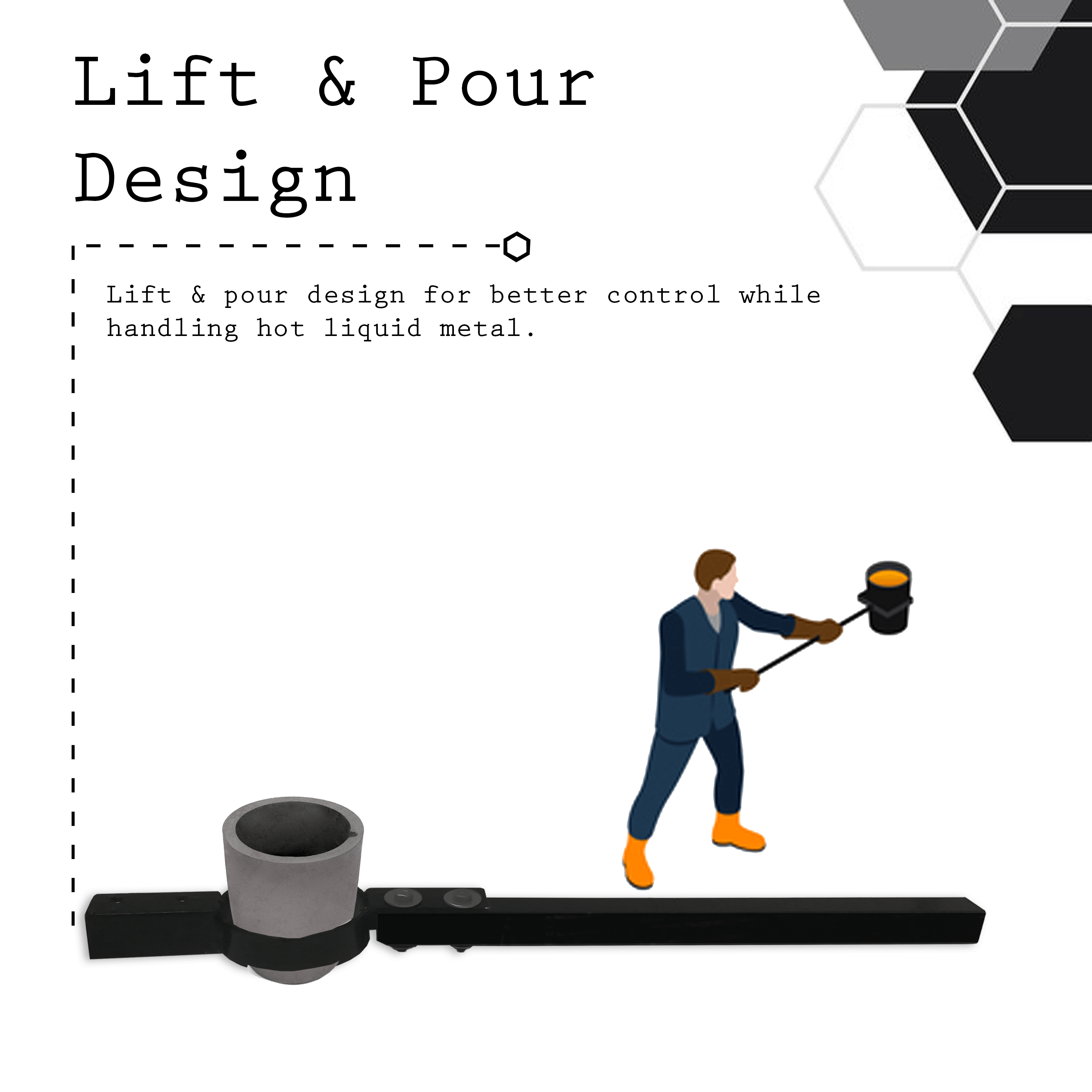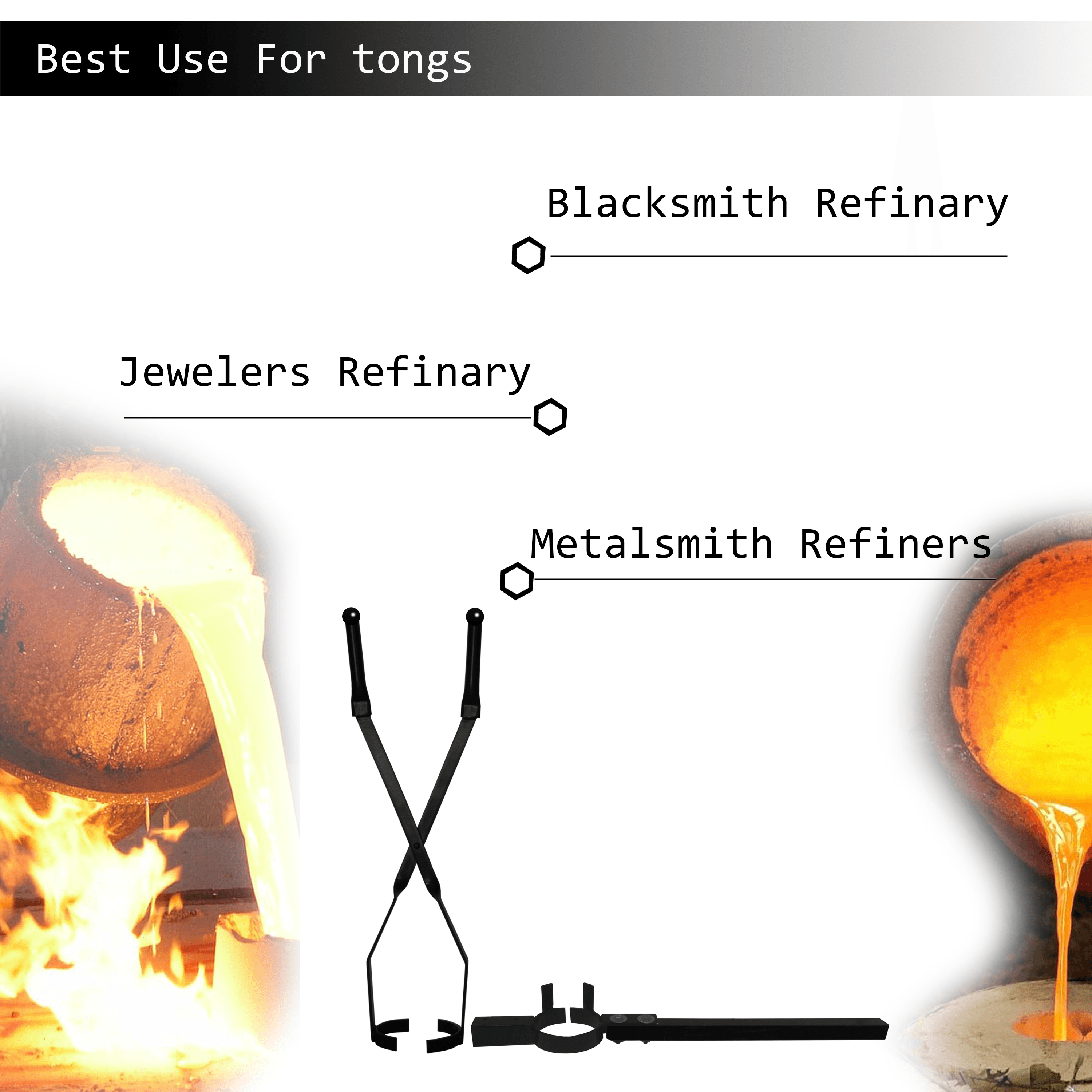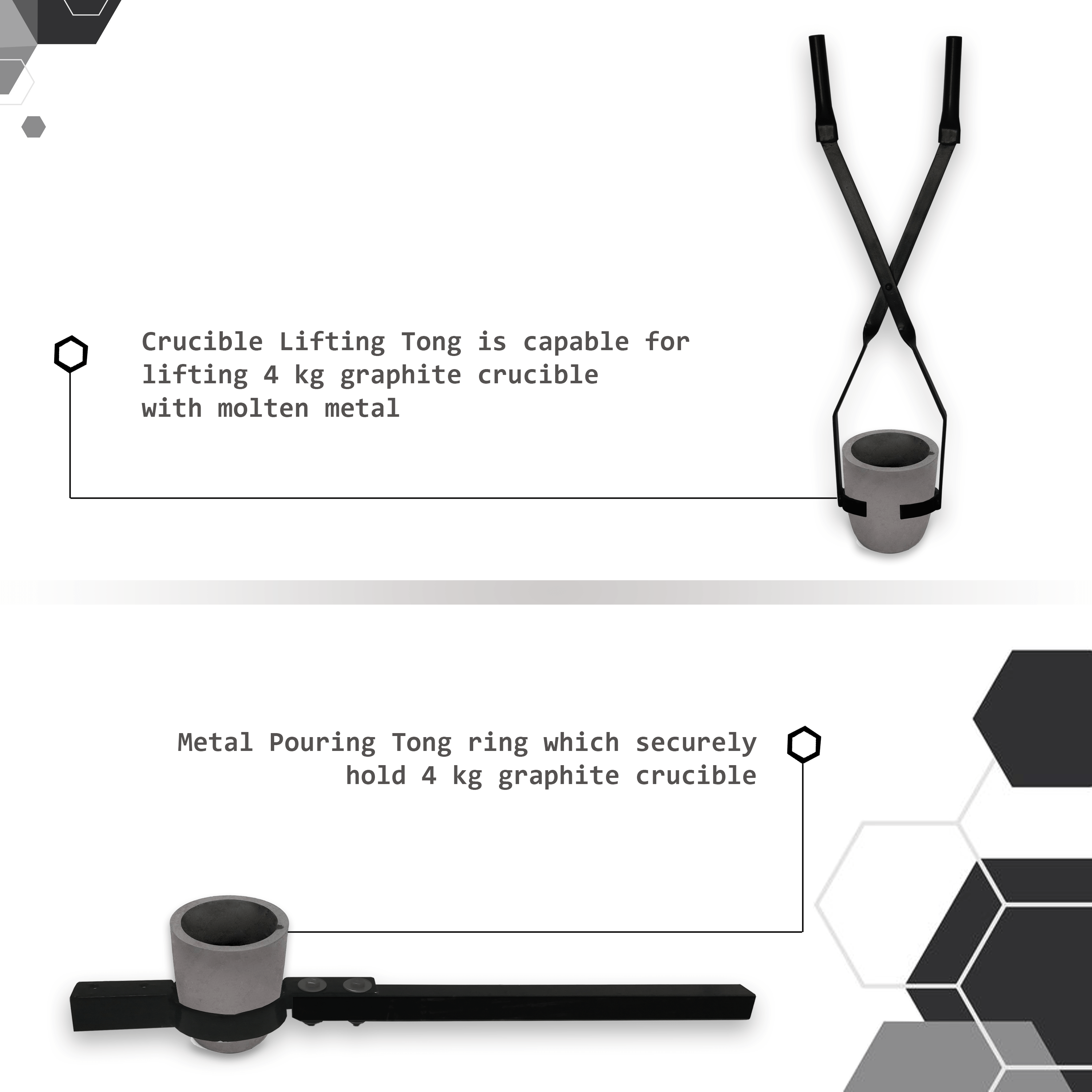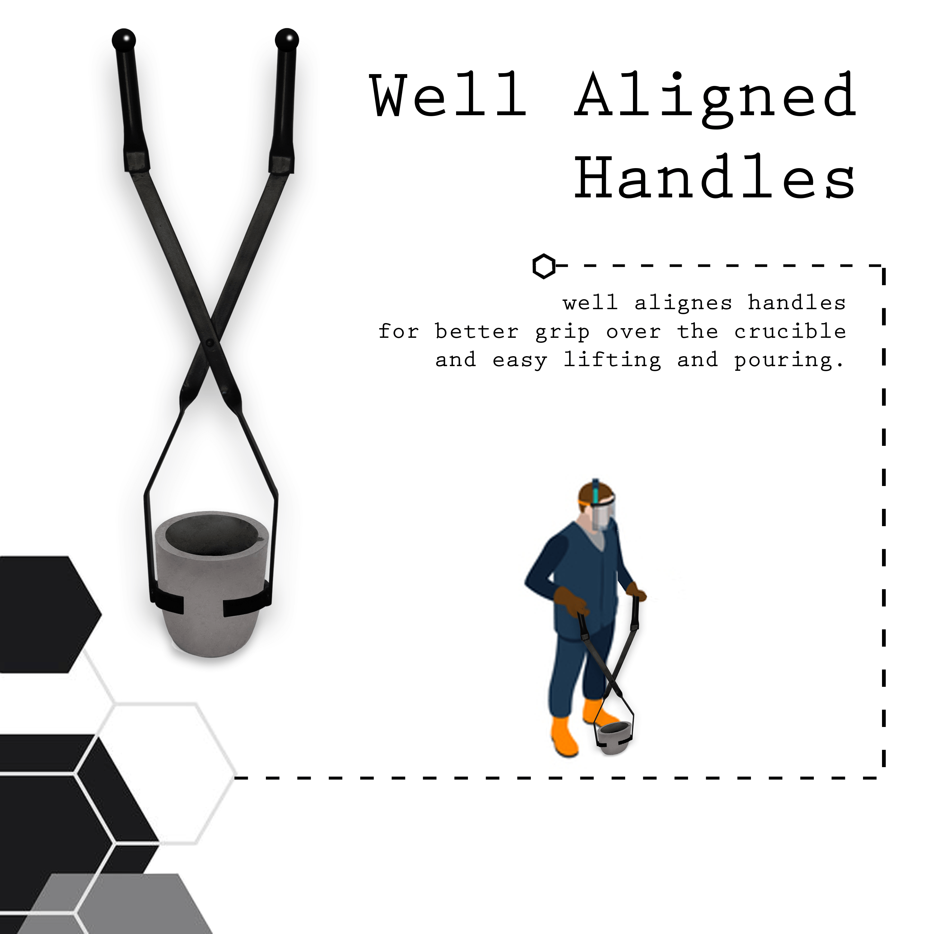 • Lift & Pour Design (Applied for Patent): Lifting tong is used to take out crucible full of molten metal from the furnace and then it is placed in pouring. This set of tongs provide better control while handling hot liquid metal. It requires two people pour the molten metal due to heavy weight of the crucible and tongs handle design.