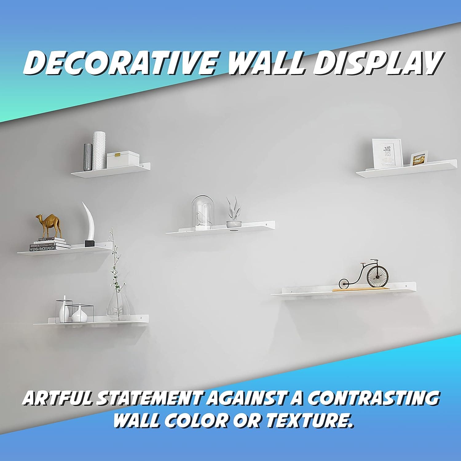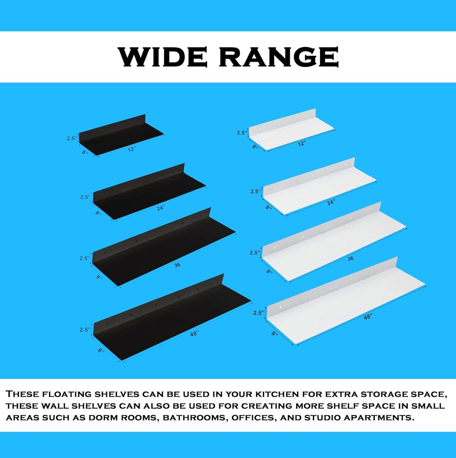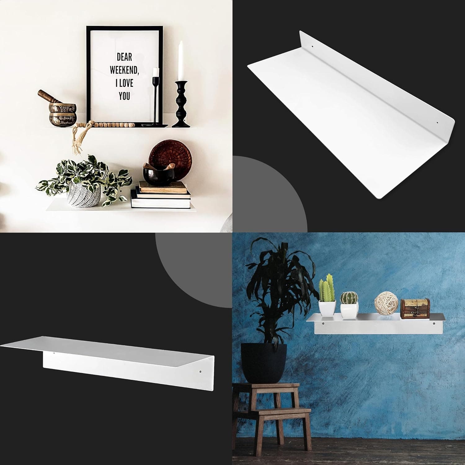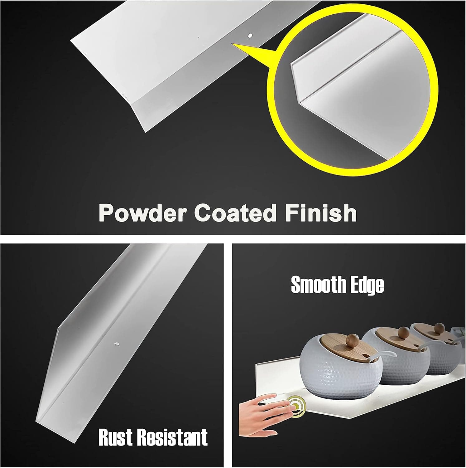 These linear floating shelves are made of bare steel and powder-coated to prevent rust buildup. This long-lasting coating looks beautiful and is resistant to chips, scratches, and dents.