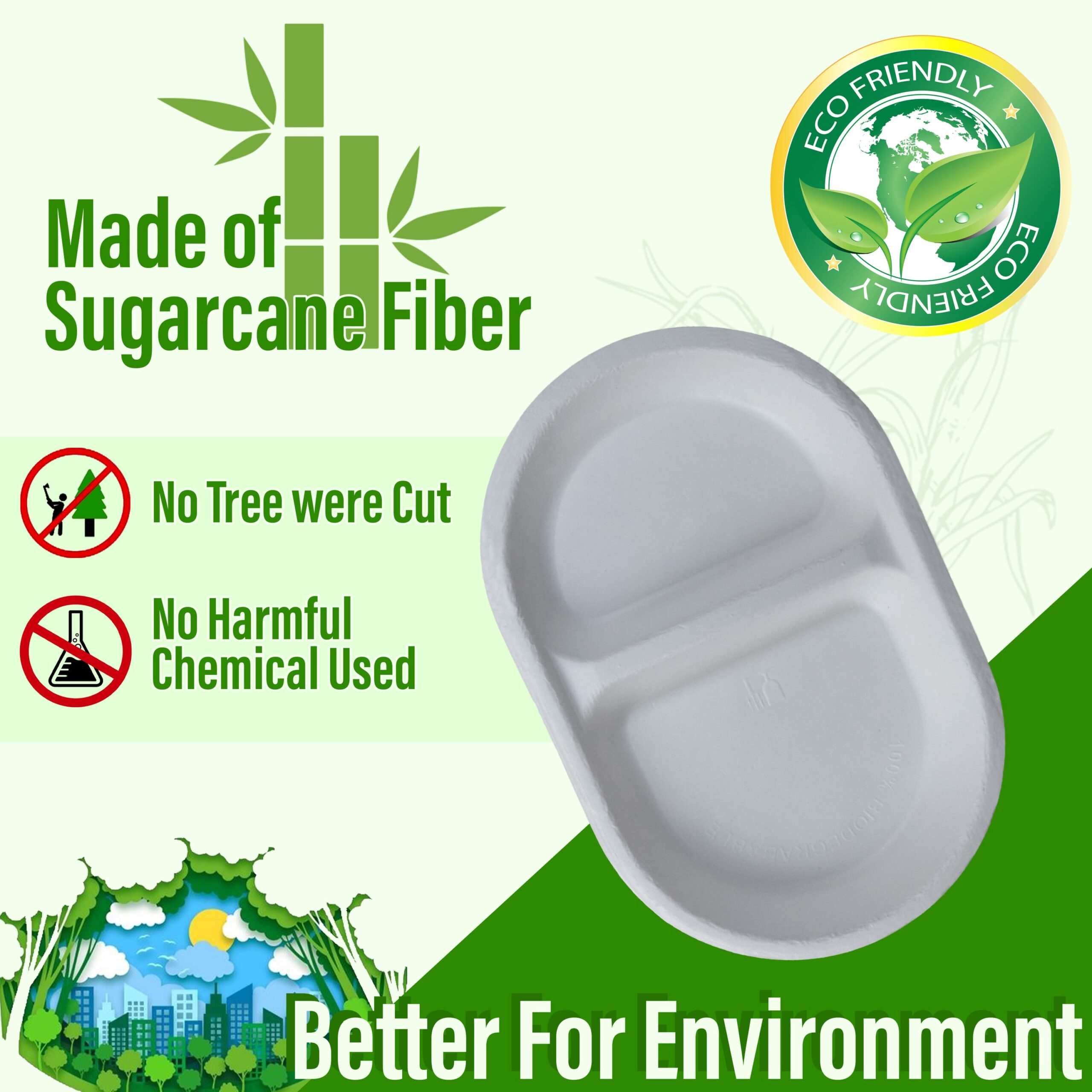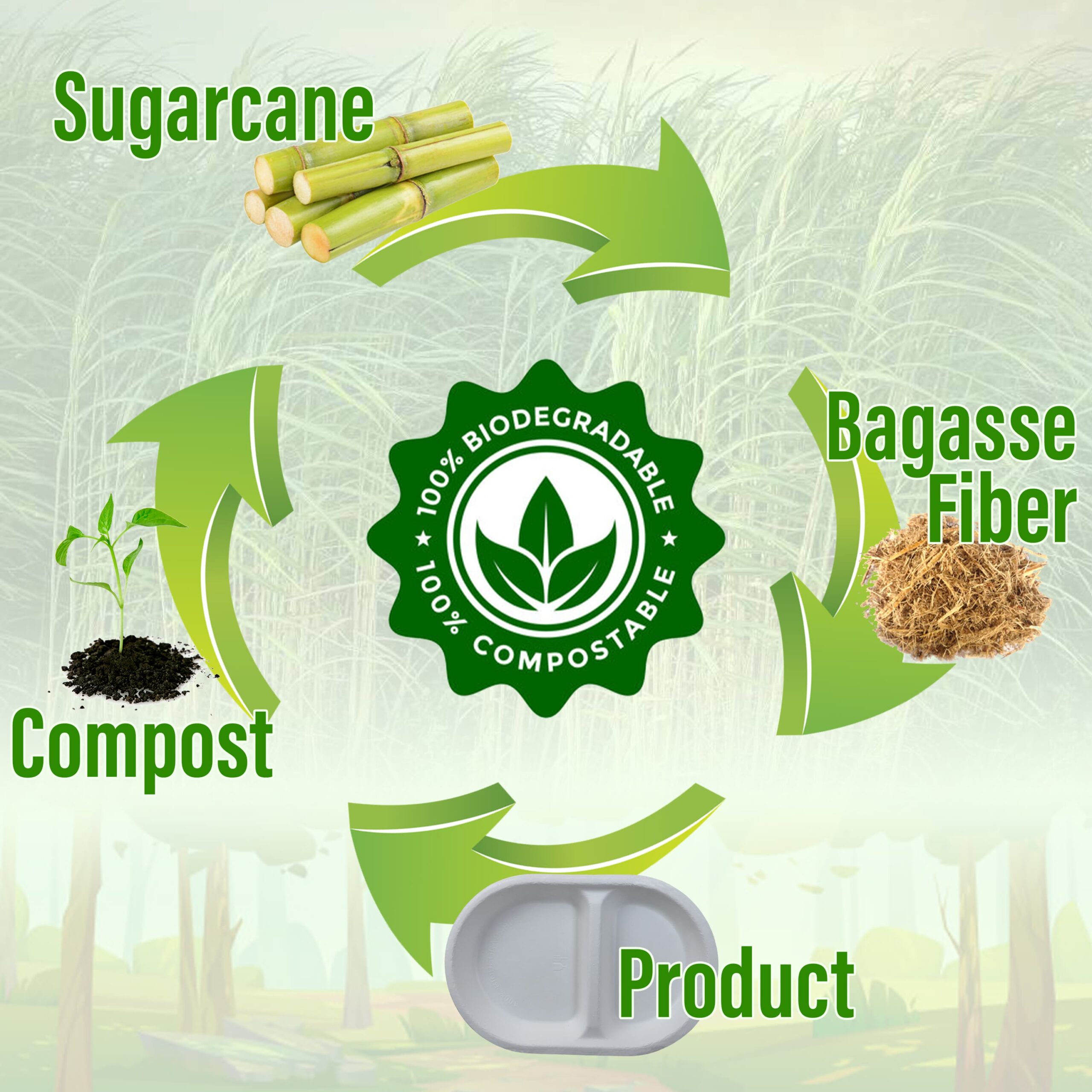 Sugarcane bagasse fiber plates are recyclable tableware made from the fibrous residue left over after extracting the juice from sugarcane. They are a more environmentally safe and sustainable alternative to traditional plastic or foam plates because they are made from a renewable resource and will degrade naturally over time. These plates are usually recyclable and can be discarded in an Environment-Safe manner.