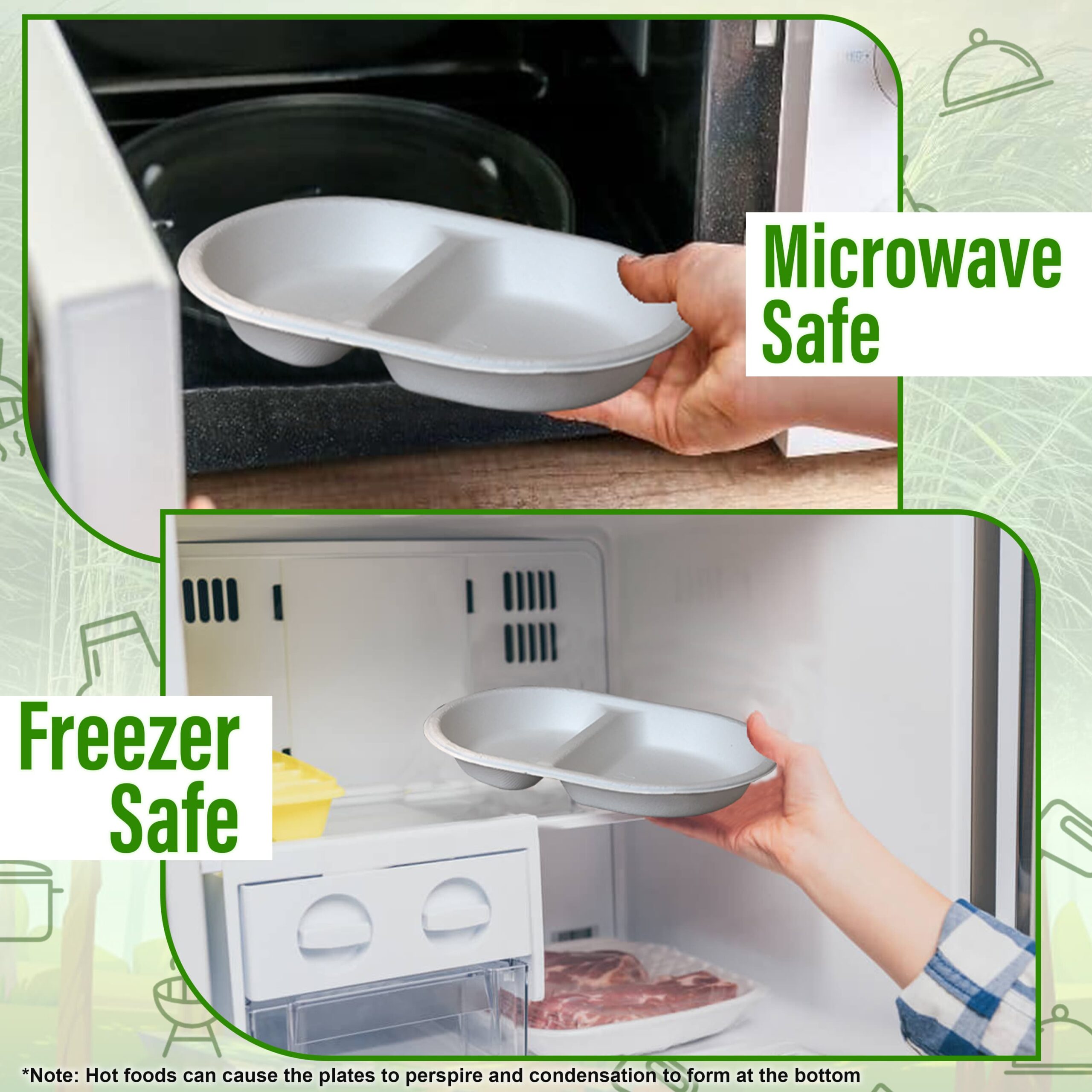 SIMOND STORE – Two Compartment Paper Trays – [Pack of 150] Disposable 100% Compostable Trays – Heavy Duty Eco-Friendly – Sugarcane Bagasse Fiber Biodegradable Trays for Party, BBQ, Wedding